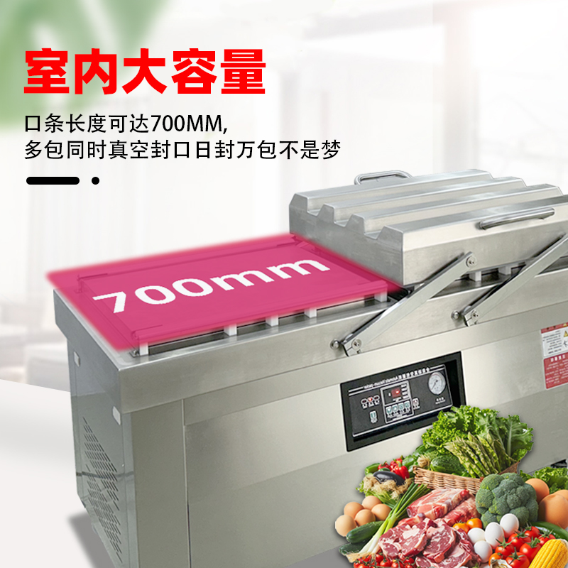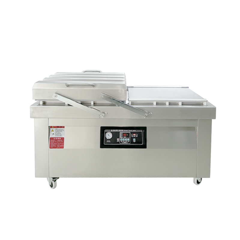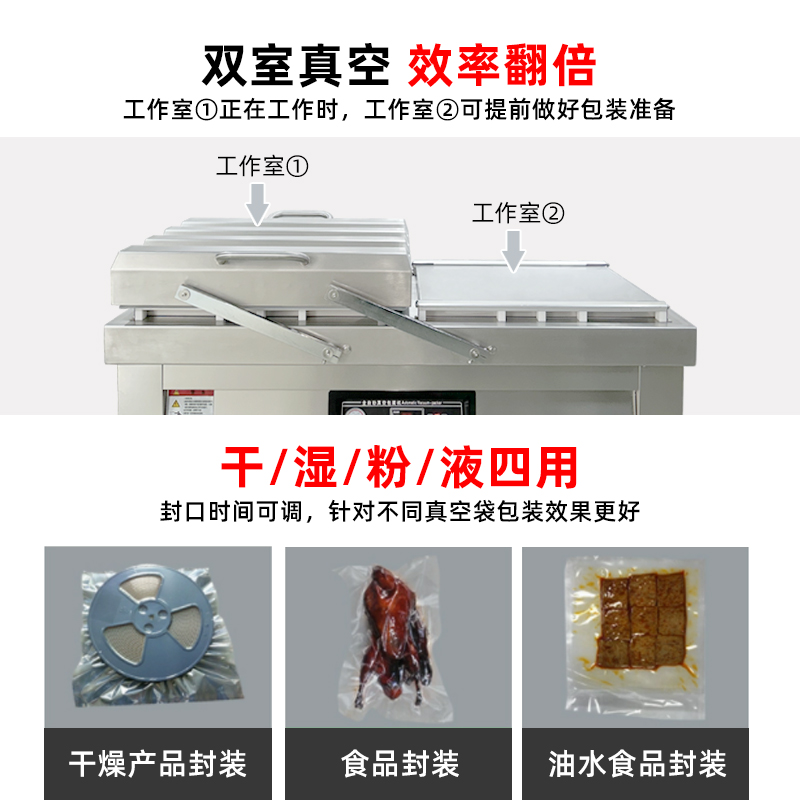 雙室真空包裝機(jī)通過 “雙真空室輪換作業(yè)” 實(shí)現(xiàn)抽真空與裝袋無縫銜接,核心是利用兩個獨(dú)立真空室的 “時間差并行操作”,讓設(shè)備在同一周期內(nèi)同時完成 “抽真空密封” 和 “人工 / 自動裝袋”,徹底消除單室機(jī)型 “抽真空時無法裝袋” 的等待間隙,大幅提升作業(yè)效率。其具體運(yùn)作邏輯和優(yōu)勢可拆解為以下 3 點(diǎn):